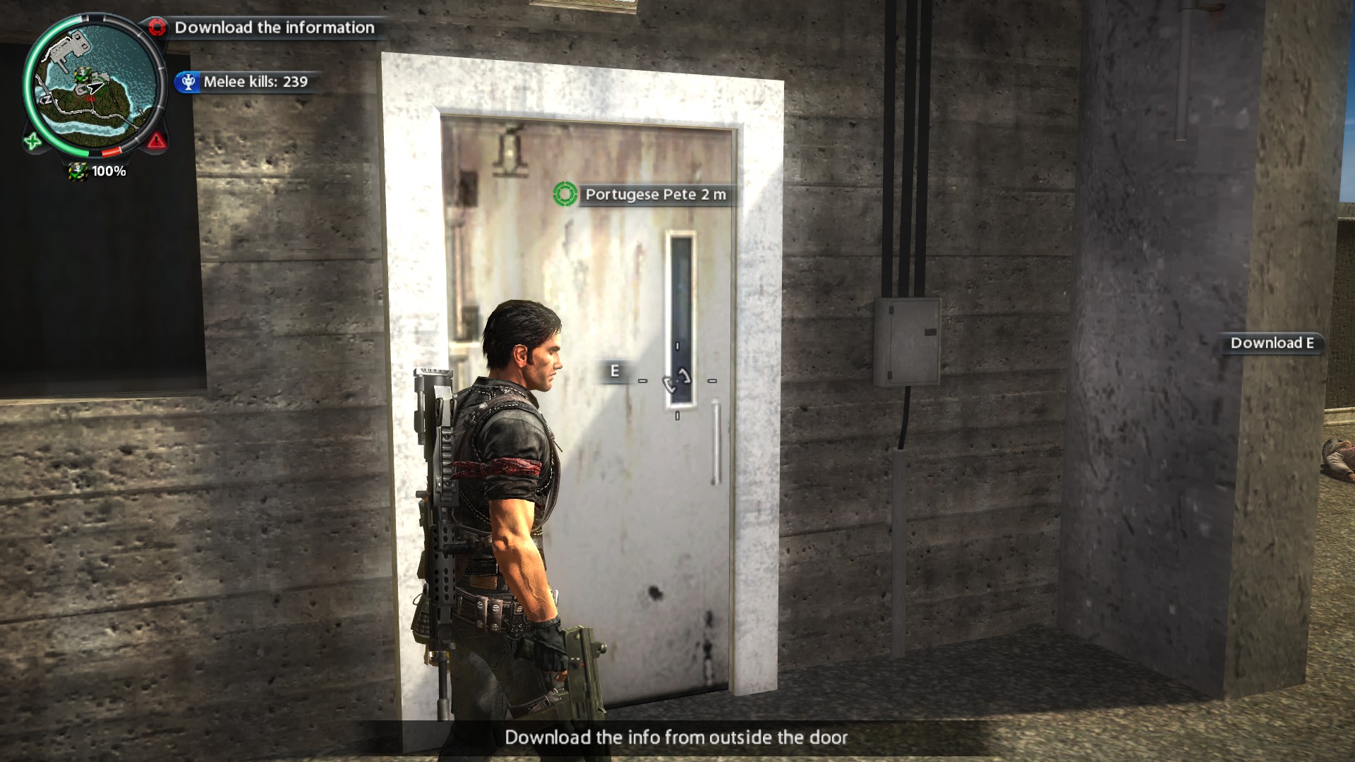 Use the provided boat (Frisco Catshark S-38) and get to Kem Port Rodrigo. Pete is held in the building near the trees. Hack into the system and stay near the door (in range for the download). Panauan soldiers will be attacking you during the entire download, but they have to climb up staircases to get to Rico, so it shouldn't be too difficult to kill them.