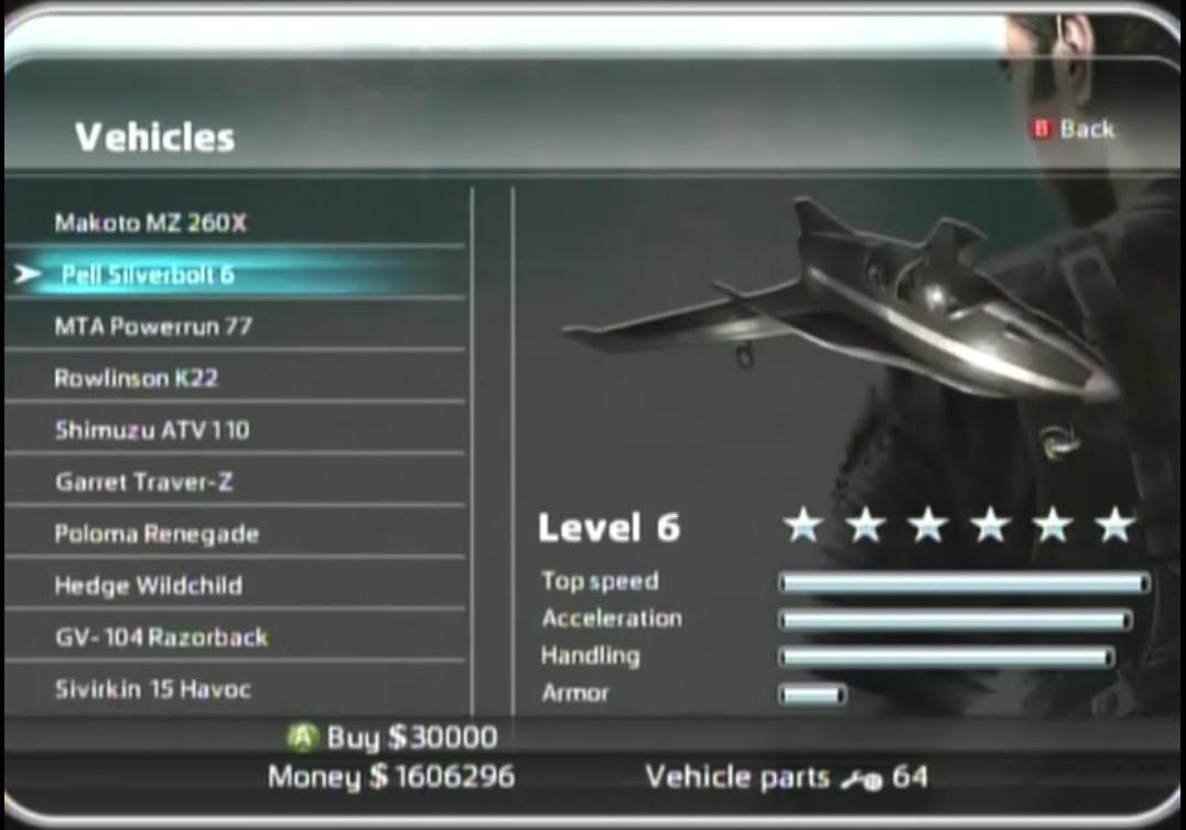 Weapons and vehicles can be upgraded by the corresponding Resource Parts (see Just Cause 2 General Gameplay Tips for more info about them). Each vehicle and piece of equipment begins at level 1 (default) and can be upgraded to level 6. As a weapon is upgraded, its damage, rate of fire, accuracy, magazine capacity and maximum reserve ammo increase. Likewise, as a vehicle is upgraded, its top speed, acceleration, handling and armor rating increase, with some of them gaining additional weapon. The amount of parts needed per upgrade increases by 5 as the levels progress. For example, if you have a level 1 pistol and you want to upgrade it to level 4, you would need 30 weapon parts to upgrade it at any one time; 5 parts for level 2; 10 more for level 3 and 15 more for level 4 etc.