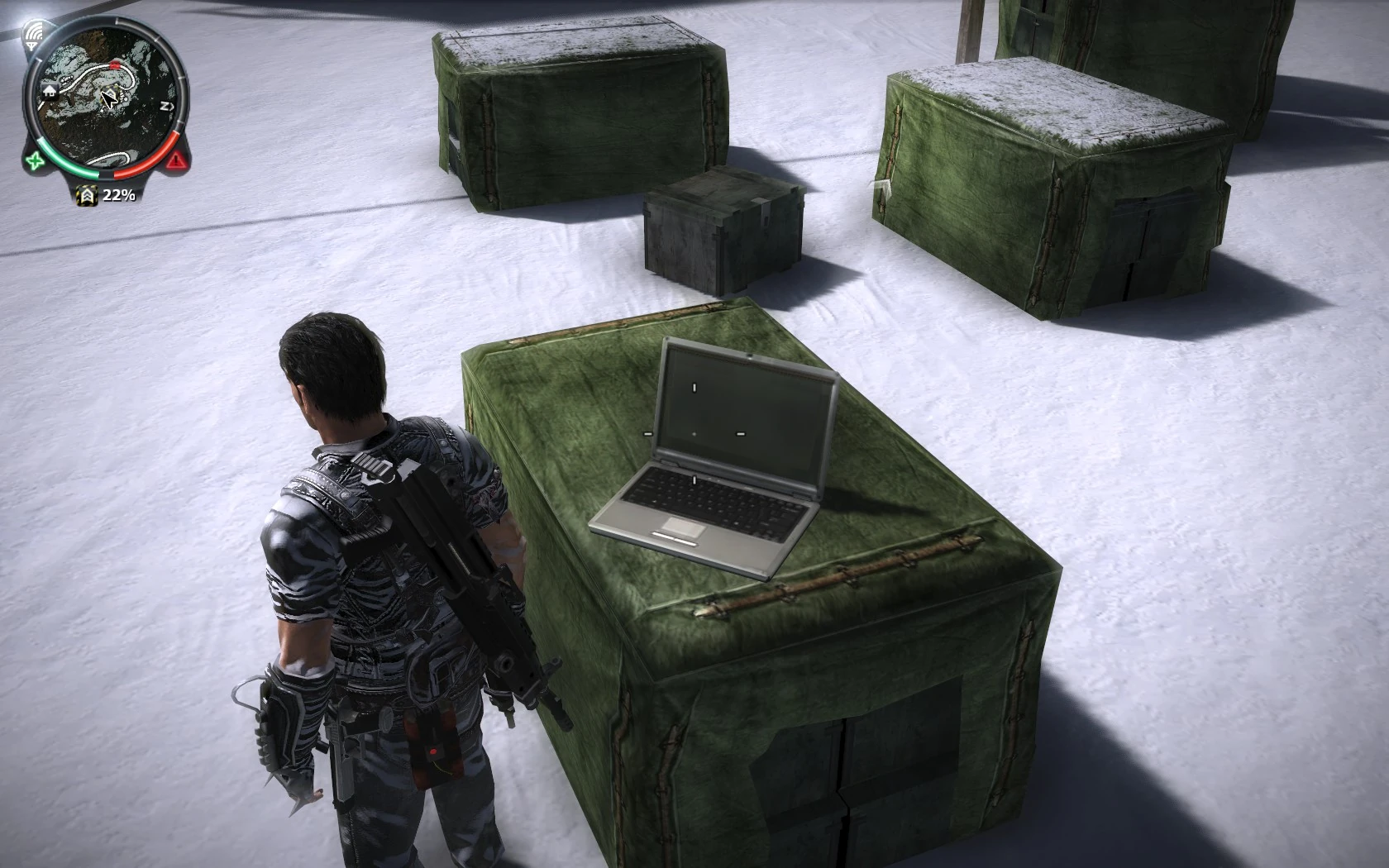 Take out the nearby troops guarding the barricaded road up to the military base, then drive up. Bolo identifies a laptop that you are to reprogram so the missiles will no longer be a bother. If you haven't already killed him in during a random visit, Colonel Ismaryanto is stationed at this base. As with all colonels, he's surrounded by elites. Or you could sneak around him to the other side of the base. The entrance is flanked by unmanned miniguns. Snatch one; take out the colonel and clear a path to the laptop. Reprogram it and complete the mission.