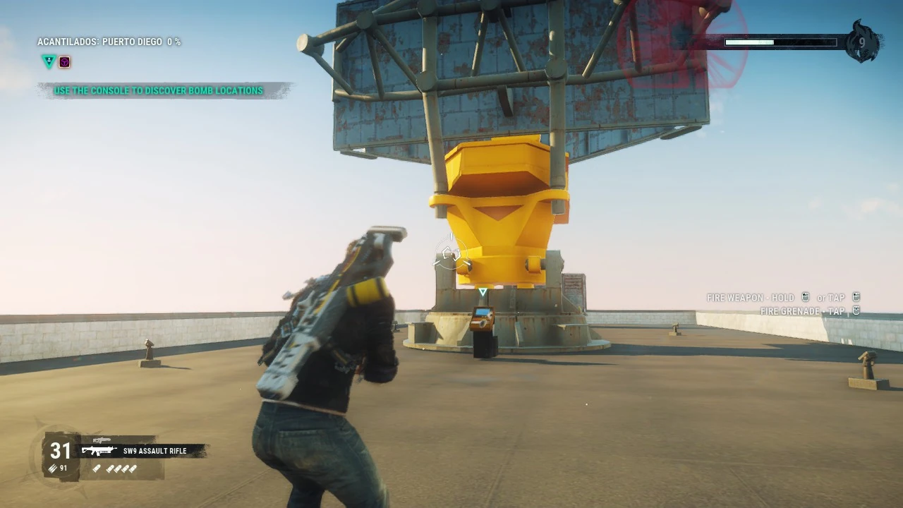 Rico arrives at Puerto Diego and is told to check a console atop a building, near an old radar. "Hacking" the console reveals the rigged vehicles.