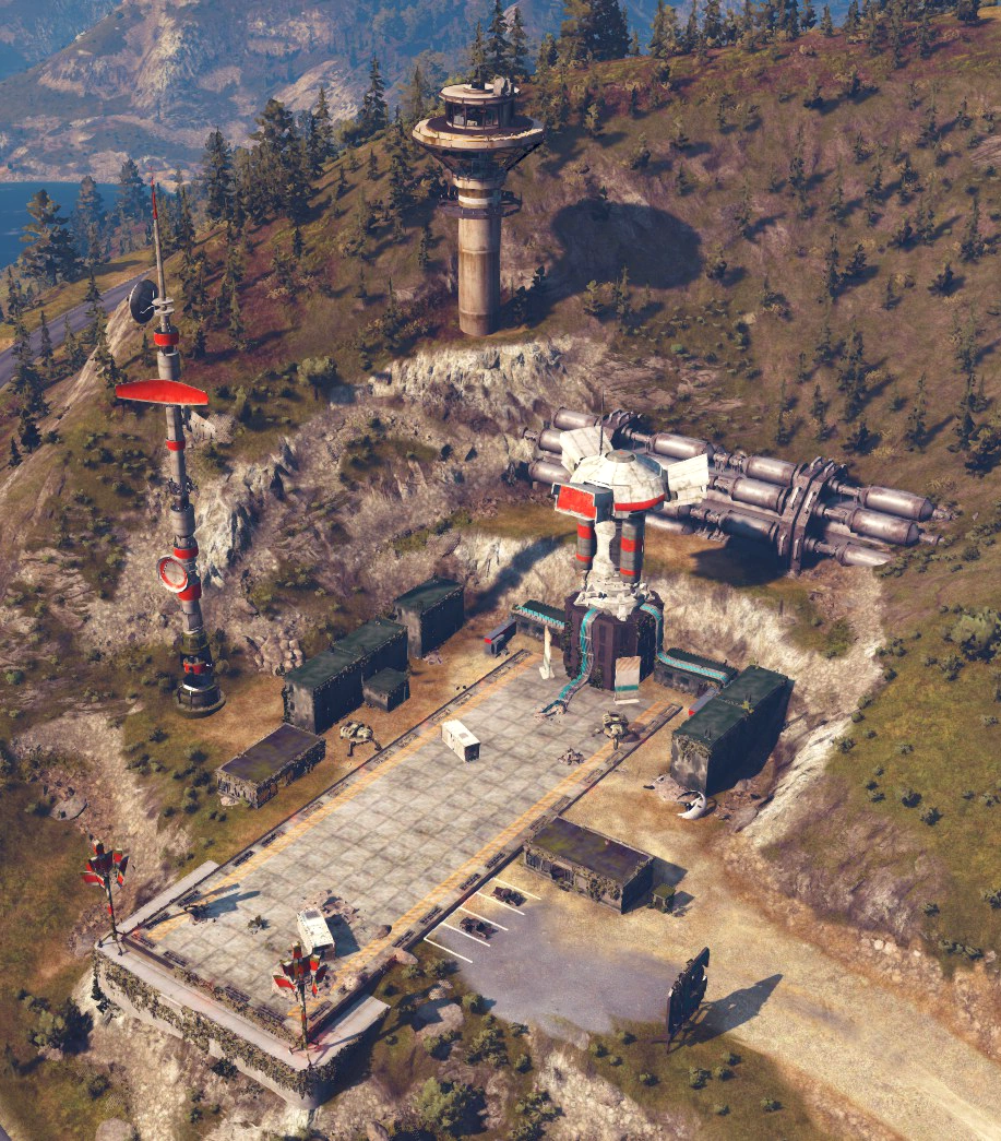 The described "drone deployer" is the Drone Depot, which is still active and therefore starts ejecting drones as soon as Rico comes close enough. The station consists of seven buildings, built around an 80m long runway and an air traffic control tower. The station is located on top of a small mountain. A large metallic structure is built behind the Drone Depot, but its purpose is unknown. Three crashed drones are scattered around the base and a big eDEN logo stands next to the entrance.