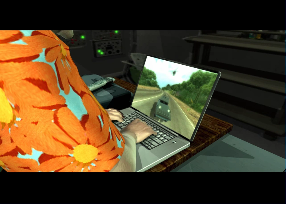 - During the mission Broadcast News, right after Tom Sheldon finished briefing Rico about the mission in the back of his Pocumtuck Nomad and as Rico walks out, it's shown that Tom is playing Just Cause (1) on his laptop, driving a Ballard Sentry STRL - 14.