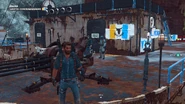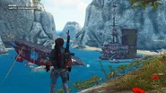 The most notable feature is the wreck of an old aircraft carrier. The aircraft carrier wreck is very strangely angled, making it seem that a half of the ship is under the mountain. A part of the flight-deck is sticking out of the water at 45 degrees, but the "island" structure is completely horizontal. Anything behind the island is under the mountain. Also very strangely, the shape of the island and the two aircraft launch catapult rails at the end of the flight deck both indicate that the up-angled end of the ship is the front end of the ship, but contradictingly, it has three 5-bladed propellers. It's not too uncommon for ships to have propellers at both ends, but this ship has a rudder there too. The rudder design indicates that it must be the rear of the ship. It has the most Inflatable liferafts of any single location.