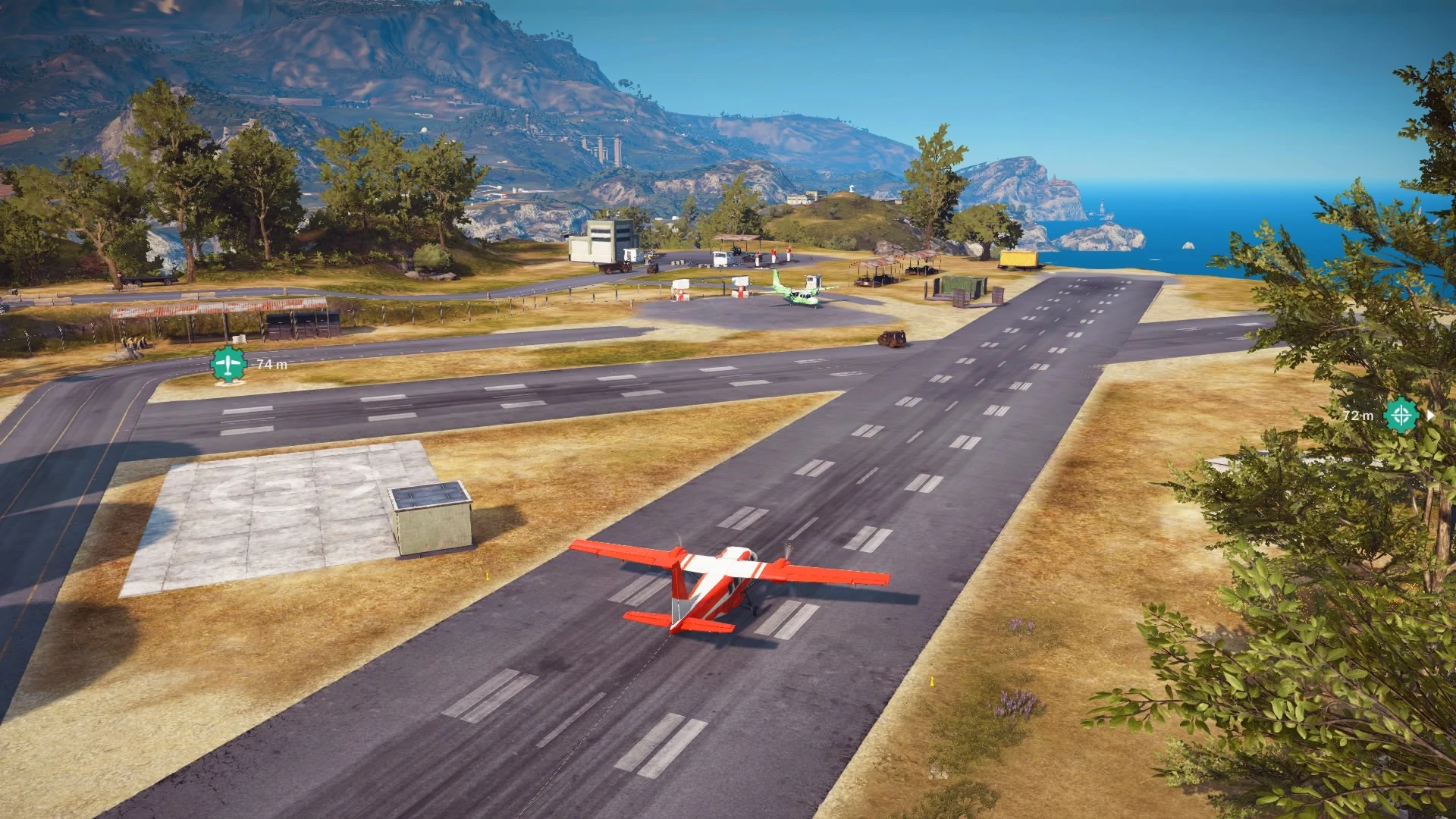 Just outside of its borders is a small airfield, complete with two paved intersecting runways, a helipad and a disproportionately large air traffic control tower. The two runways are connected via a thin taxiway to a small hard-standing for two Urga U17 Akrobats. Located elsewhere on the base are three tall fuel silos, several fuel pumps, lots of shipping containers and two usual buildings. However, note that patrol vehicles from the outpost will sometimes appear on the airfield.