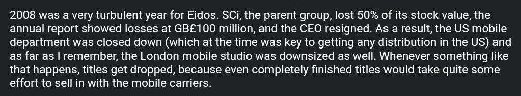 According to different sources, it was developed by a company called "Progressive Media" for "Eidos Mobile", or by both of them in co-operation.