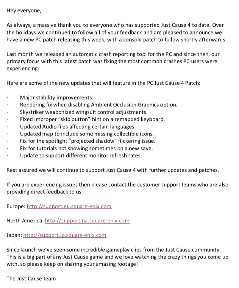 We hope that the latest fixes work towards improving your experience with Just Cause 4. Once again, a huge thank you to everyone who has supported the game to date, we really appreciate your patience while we work on further fixes.