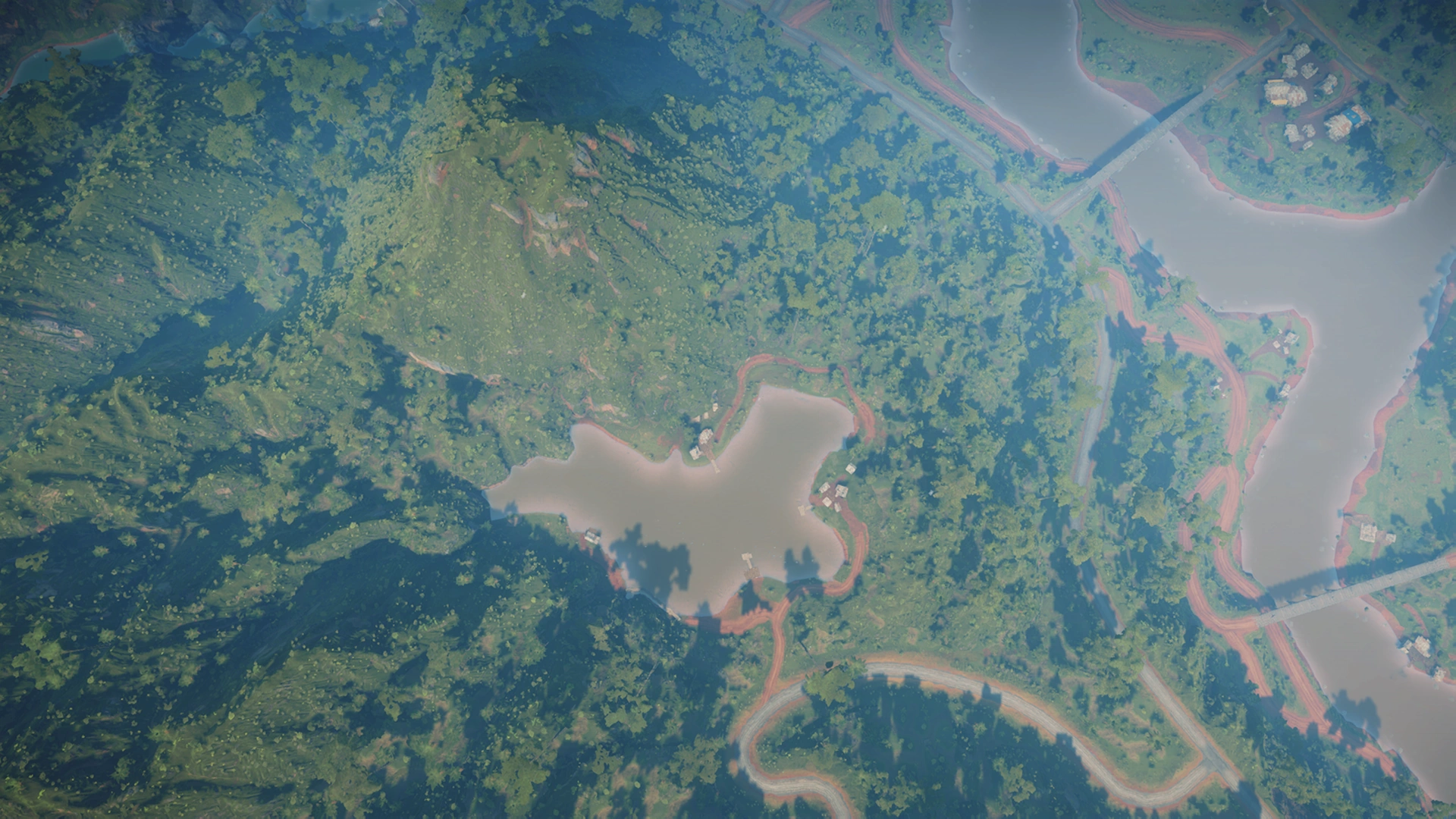It's a small lake with multiple small shacks surrounding it. There are also three small docks and a small bridge.
