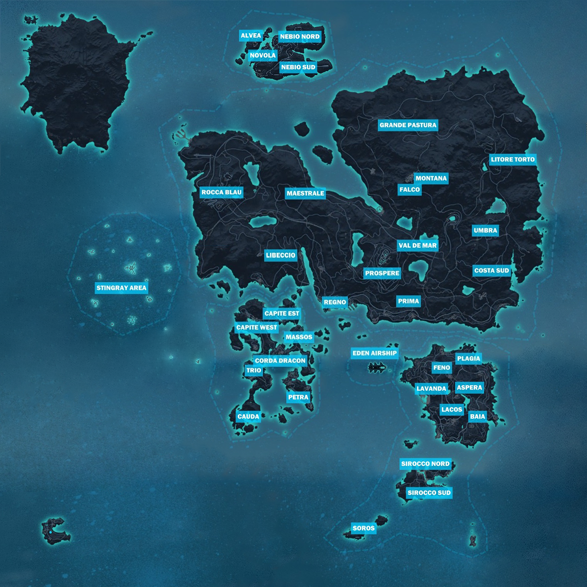 | Provinces | Alvea (DLC) · Aspera · Baia · Capite Est · Capite West · Cauda · Corda Dracon · Costa Sud · eDEN Airship (DLC) · Falco · Feno · Grande Pastura · Lacos · Lavanda · Libeccio · Litore Torto · Maestrale · Massos · Montana · Nebio Nord (DLC) · Nebio Sud (DLC) · Novola (DLC) · Petra · Plagia · Prima · Prospere · Regno · Rocca Blau · Sirocco Nord · Sirocco Sud · Soros · Trio · Stingray Area (DLC) · Umbra · Val de Mar |