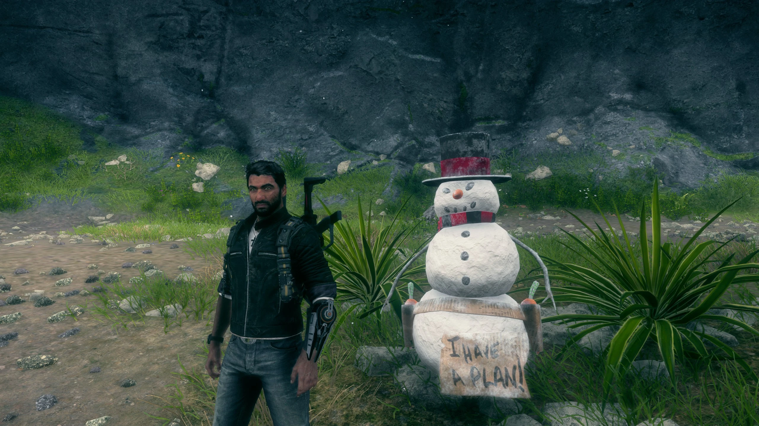 Once again, Mr. Snowman is back. He is located at the bottom of Cueva de los Susurros and this time holds a sign that says "I have a plan!". When Rico approaches him, he will say "What do you want from me, Mr. Snowman?", and if he is destroyed, Rico will say "Answer me!"