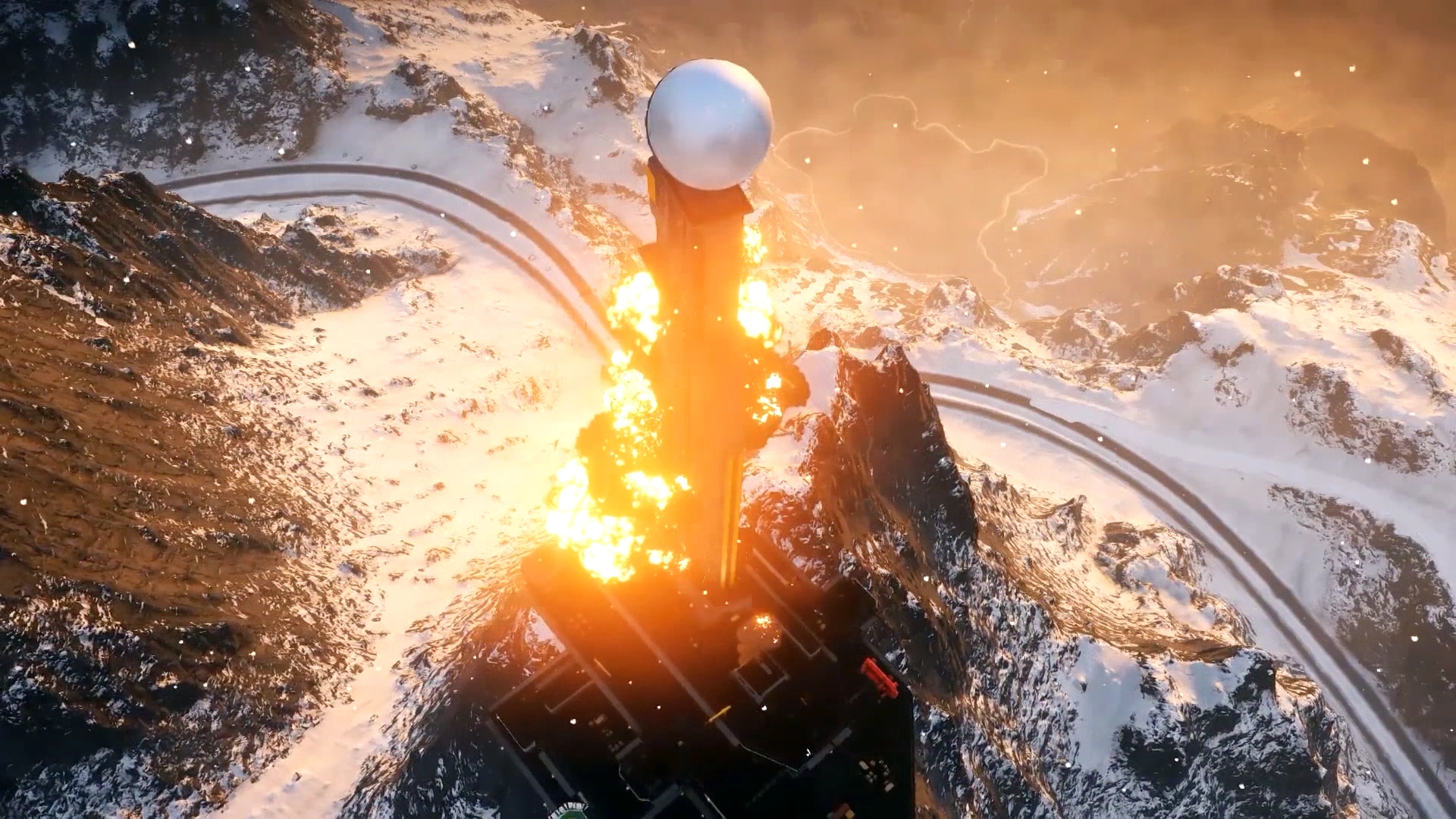 Before Operation Windwalker, this place is effectively impossible to approach. Should Rico get too close, a huge number of artillery projectiles (or rockets, or missiles) will start raining down from the sky. These seem to come from special Defense Cannons that fire a barrage of artillery shells rather than a single one. At the end of the mission, the tower is shown to explode, making it safe to approach.