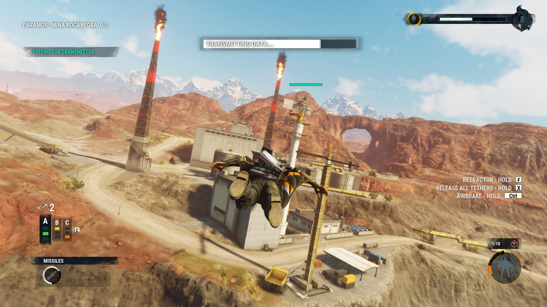 Multiple transmitters will be raised, but one at a time. Rico has to defend them all. Fortunately, there are unmanned Spectre Attack Helicopters on the ground that can be used. There are also plenty of Black Hand Firebrand Scout Choppers that can be hijacked.