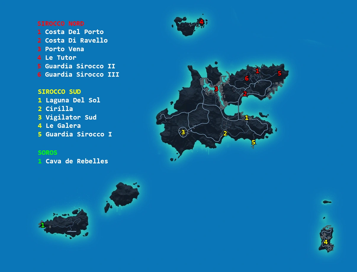 | Provinces | Alvea (DLC) · Aspera · Baia · Capite Est · Capite West · Cauda · Corda Dracon · Costa Sud · eDEN Airship (DLC) · Falco · Feno · Grande Pastura · Lacos · Lavanda · Libeccio · Litore Torto · Maestrale · Massos · Montana · Nebio Nord (DLC) · Nebio Sud (DLC) · Novola (DLC) · Petra · Plagia · Prima · Prospere · Regno · Rocca Blau · Sirocco Nord · Sirocco Sud · Soros · Trio · Stingray Area (DLC) · Umbra · Val de Mar |