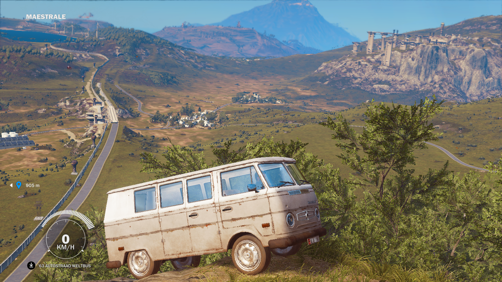 '63 Autostraad Weltbus off-roading at Maestrale. The Vulture base is visible on the right and the Volcano Island in Medici is in the far center. The Unnamed industrial facility at N 40 46.590 E 5 37.400 is in the middle of the left edge.