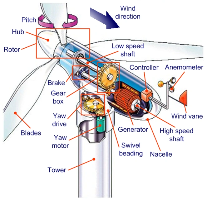 Wind Turbines are basically miniature electrical power plants. Wind pushes the large propeller blades, making the propeller spin. The propeller is connected to a large generator, built into the top of the tower. The top of the tower is able to rotate, to face the direction of the wind.